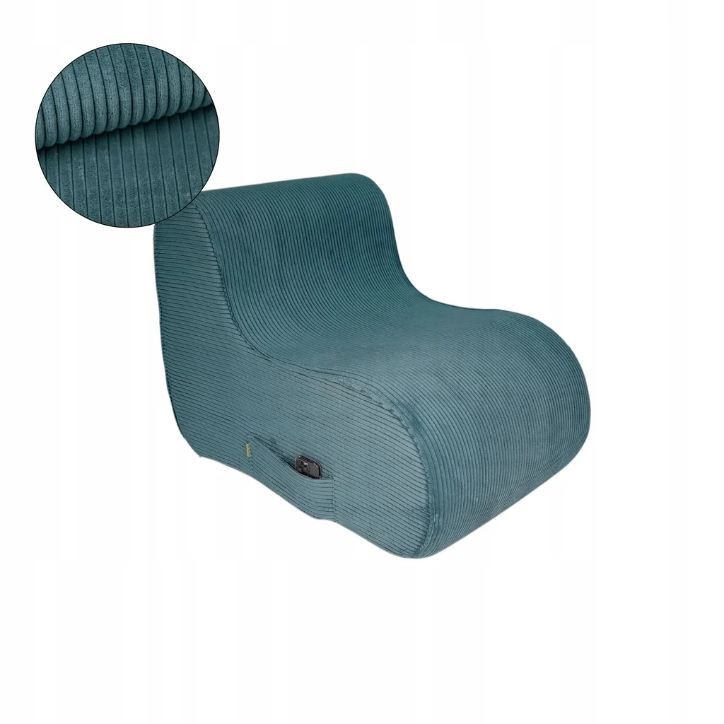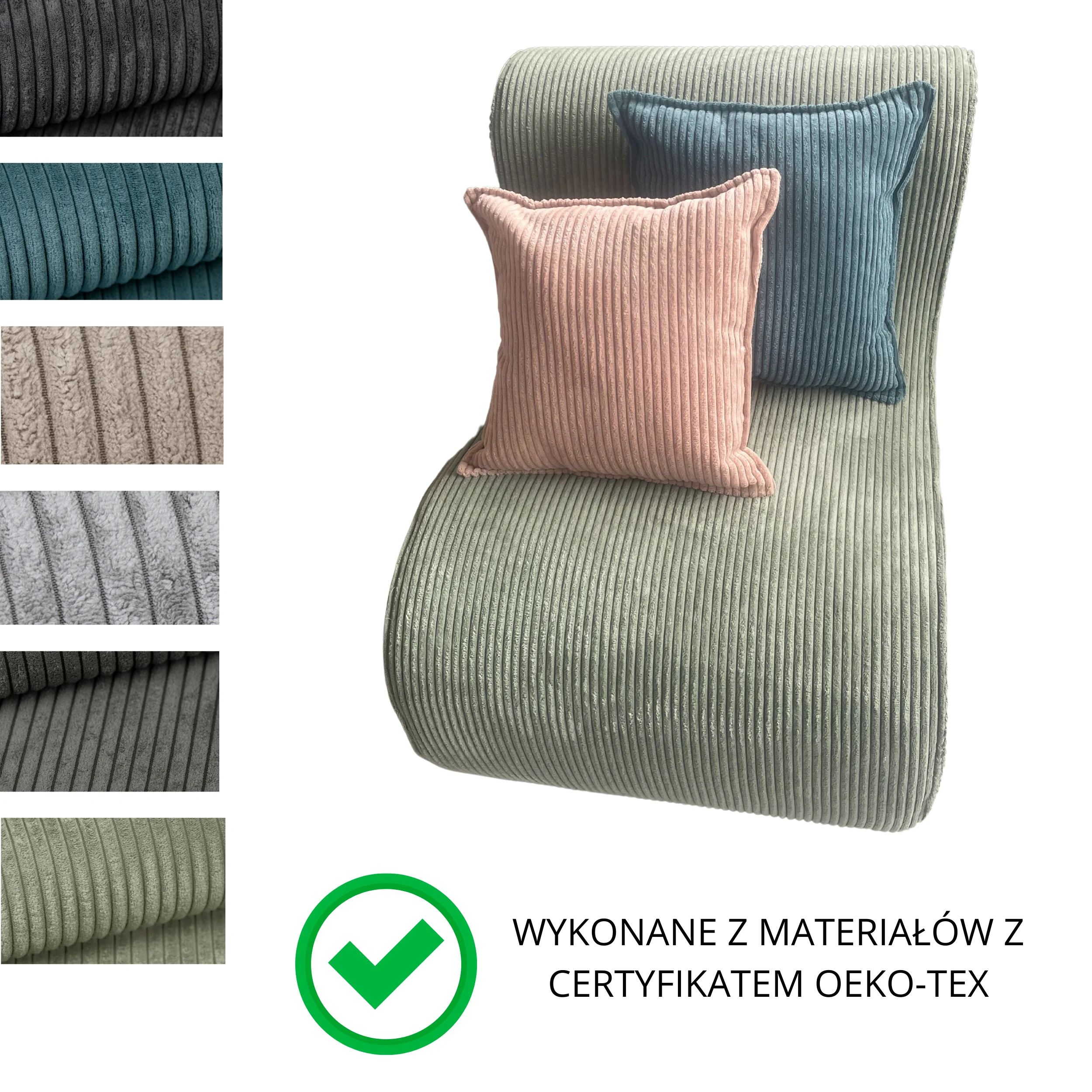 Fotel jest obity sztruksową tkaniną, która jest nie tylko trwała i odporna na uszkodzenia, ale także niezwykle miękka i przyjemna w dotyku. Sztruksowa tkanina świetnie układa się na fotelu, nadając mu miękkość i puszystość, a jednocześnie zapewnia estetyczny wygląd przez długie lata. Pokrowiec jest ściągany i zapinany na zamek błyskawiczny, co umożliwia łatwe zdejmowanie i pranie w pralce w temperaturze do 60 stopni, zapewniając higieniczne warunki użytkowania.