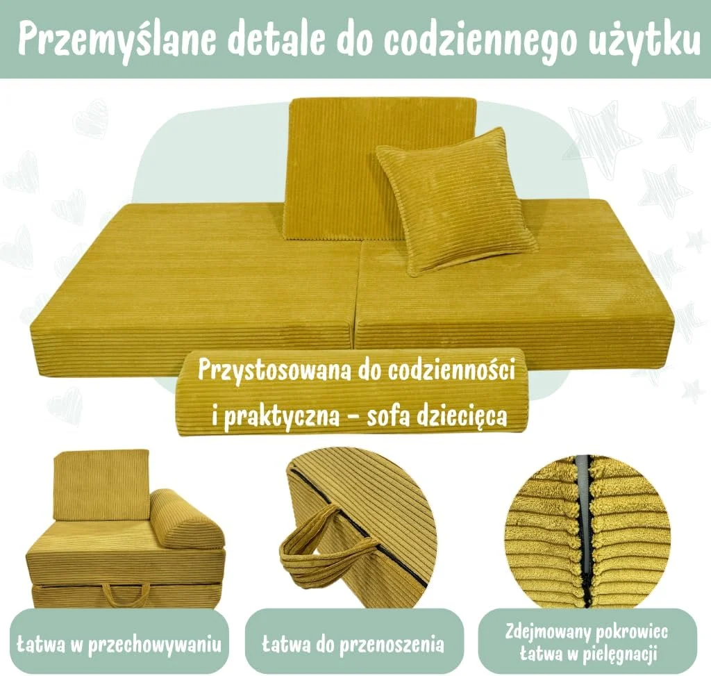 Sofa dziecięca modułowa rozkładana fotel została zaprojektowana z myślą o łatwej pielęgnacji. Ściągane pokrowce z sztruksowej tkaniny można łatwo zdjąć i wyprać w pralce, co pozwala na utrzymanie sofy w czystości i świeżości nawet przy intensywnym użytkowaniu. Regularne pranie pokrowców jest proste i nie wymaga specjalistycznych środków czystości, dzięki czemu sofa zawsze wygląda jak nowa.