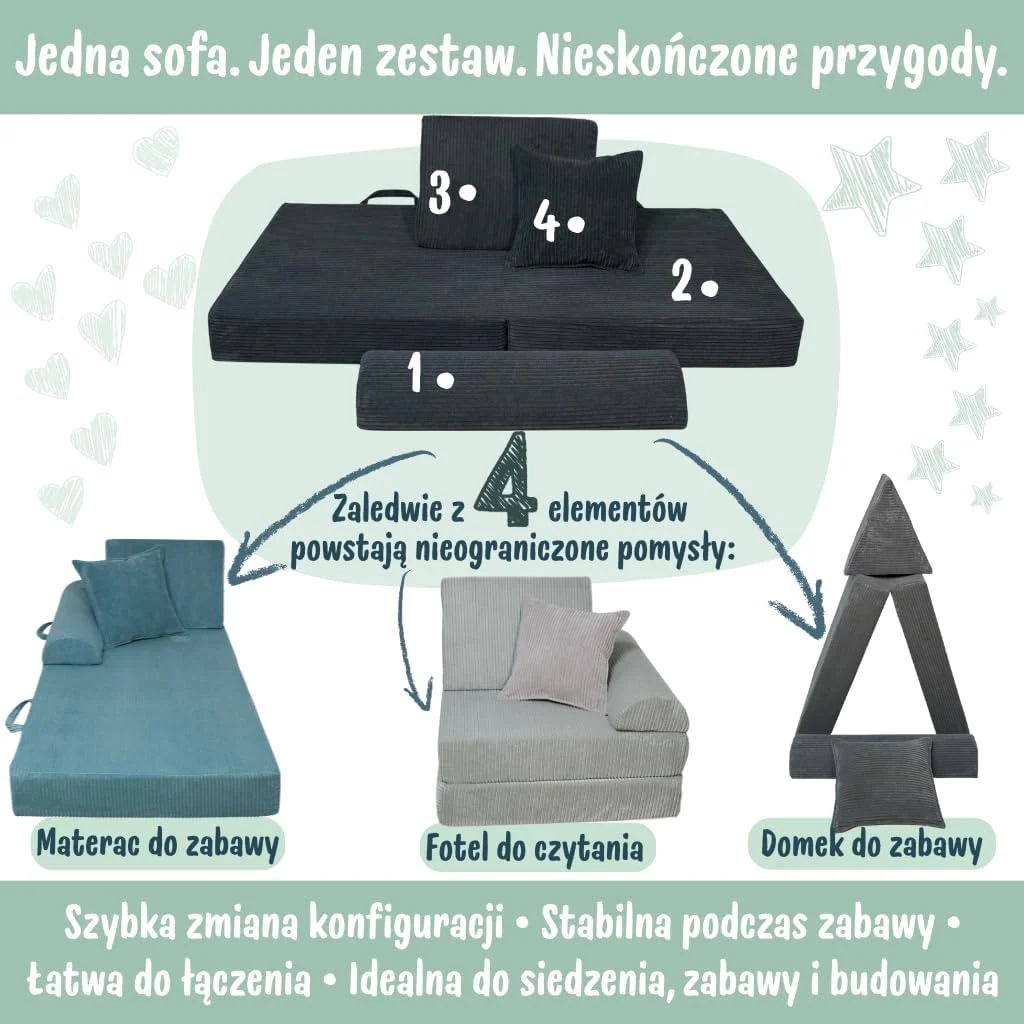 Szukasz idealnej sofy dla swojego dziecka, która nie tylko zapewni komfortowy wypoczynek, ale także stanie się atrakcyjnym elementem pokoju dziecięcego? Sofa dziecięca modułowa rozkładana fotel sztruks 4 elementy dostępna na Pillows24.pl to doskonałe rozwiązanie, które spełni wszystkie oczekiwania zarówno rodziców, jak i najmłodszych użytkowników.